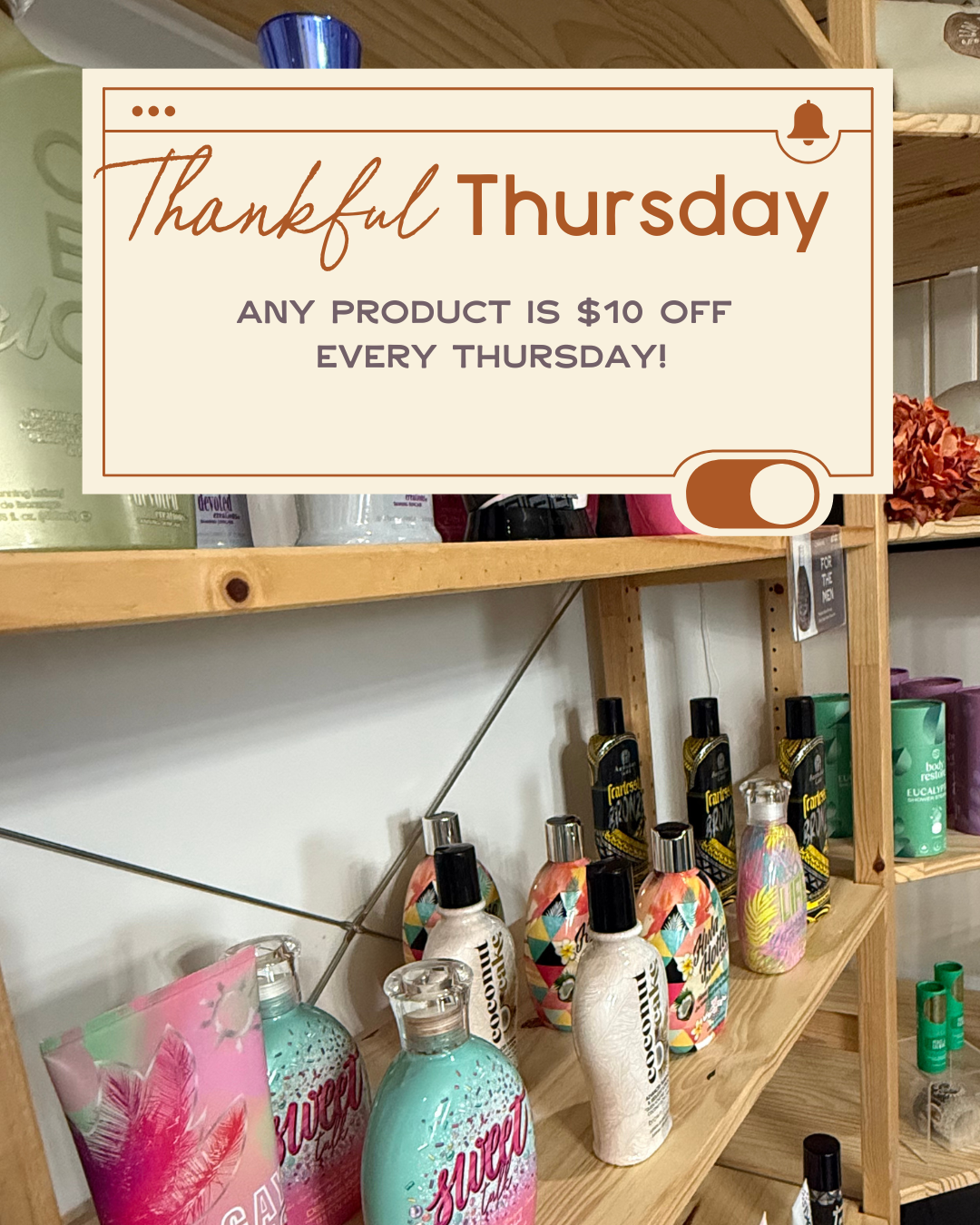 Every Thursday, say “thanks” to your skin (and your wallet). Enjoy $10 off any product—lotions, tan extenders, skincare, and more—when you shop in-studio during Thankful Thursday.