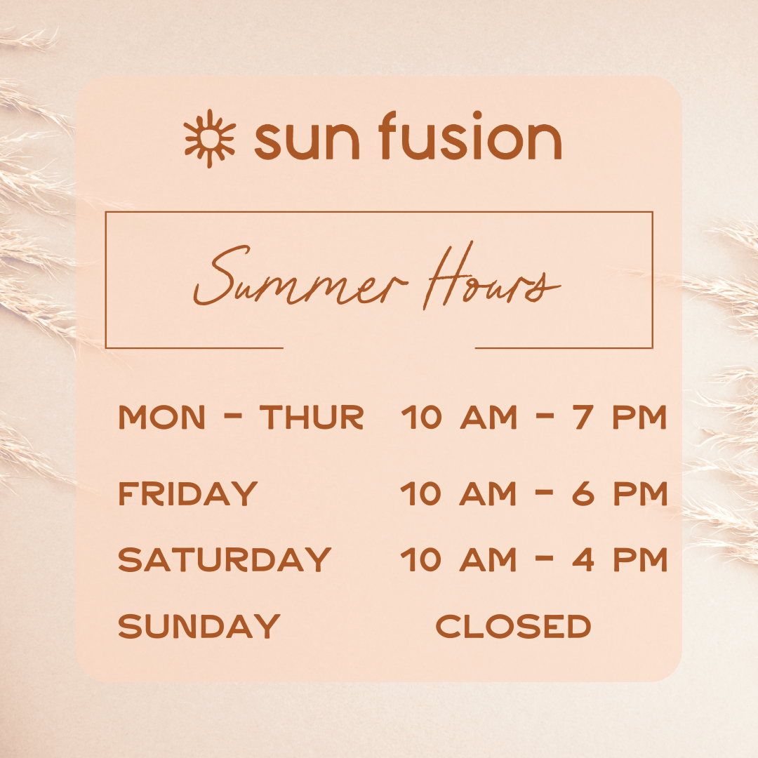 And we’re answering with updated hours to better serve your sunshine-loving, wellness-prioritizing self! Beginning June 1, Sun Fusion will be open with convenient hours to help you fit in your favorite services all season long.